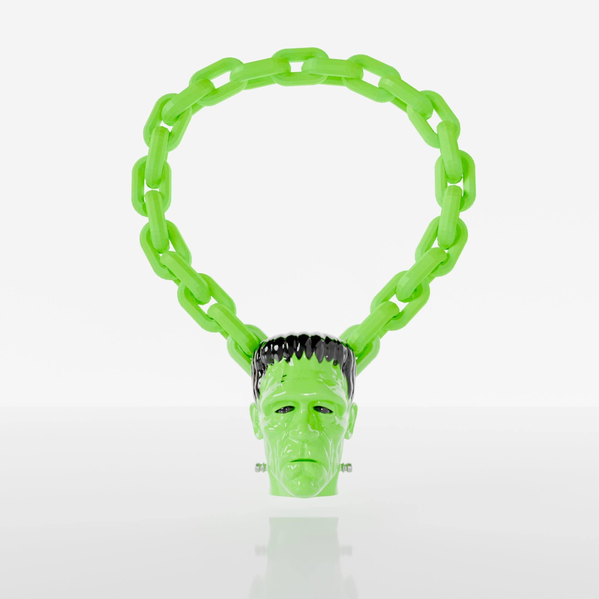 Meet FRANKI: a sculptural 3D-printed necklace featuring our electrifying icon in neon green. Chunky chain. Classic monster. Modern attitude.